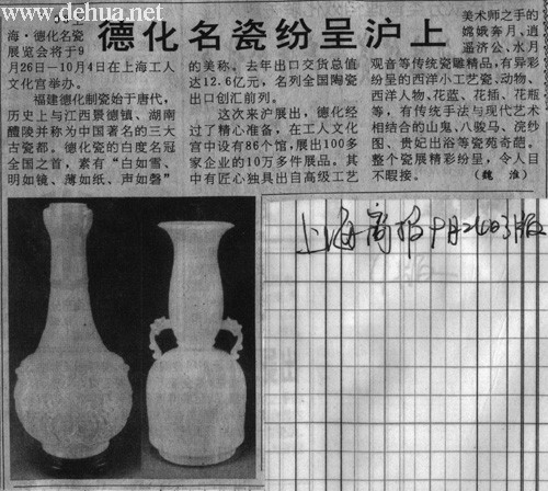9 8上海·德化名瓷展覽會將于9月26日一10月4日在上海工人文化宮舉辦。