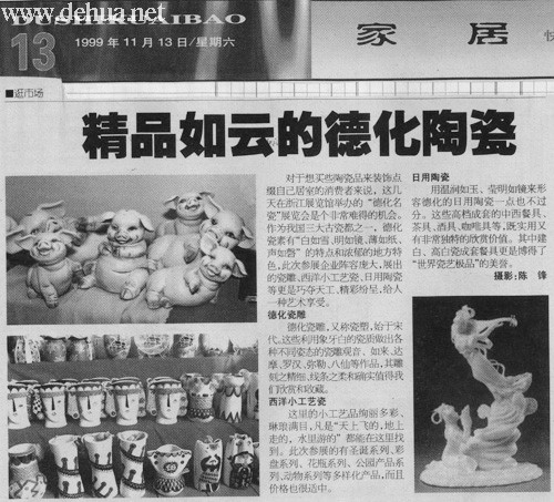 對于想買些陶瓷品來裝飾點綴自己居室的消費者來說,這幾天在浙江展覽館舉辦的“德化名瓷”展覽會是個非常難得的機會。作為我國三大古瓷都之一,德化瓷素有“自如雪、明如鏡、薄如紙、聲如磬”的特點和濃郁的地方特色,此次參展企業(yè)陣容龐大,展出的瓷雕、西洋小工藝瓷、日用陶瓷等更是巧奪天工、精彩紛呈,給人一種藝術(shù)享受。