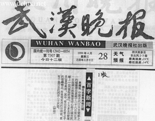 本報訊中國古代大古瓷都之一的德化縣將于二十八日至五月一日在湖北體育展覽中心給江城市民獻上一臺瓷支好戲,十萬多名瓷演員登臺亮相。其中,有出自名家之手的瓷雕精品,有美觀實用的日用瓷,更有千姿進態(tài)的西洋小工藝瓷。(鐘瓊)