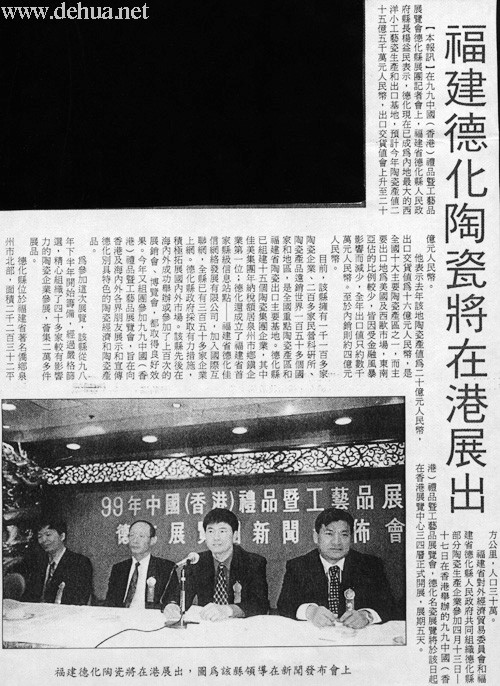 福建省對外經(jīng)濟(jì)貿(mào)易委員會和福建省德化縣人民政府共同組織德化縣部分陶瓷生產(chǎn)企業(yè)參加四月十三日——十七日在香港舉辦的九九中國(香港)禮品暨工藝品展覽會,德化名瓷展覽將于該日起在香港展覽中心三四層正式開展,展期五天。
