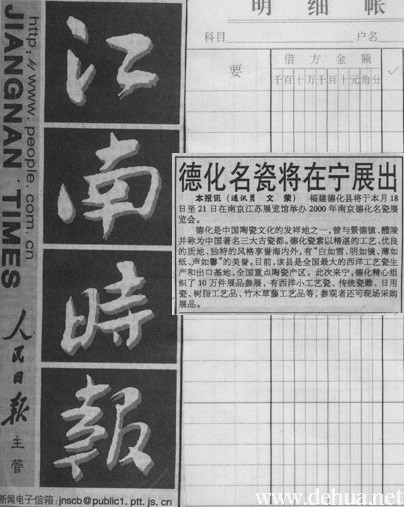 本報(bào)訊(通訊員 文 榮) 福建德化縣將于本月18日至21日在南京江蘇展覽館舉辦2000年南京德化名瓷展覽會(huì)。