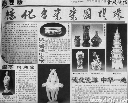 德化又推出獨(dú)樹一幟的釉下青花瓷。清末民初出現(xiàn)了聞名世界的瓷雕名師。其中“蘊(yùn)玉瓷莊”創(chuàng)始人蘇學(xué)金精雕細(xì)刻的捏塑梅花盆景,獲得了1915年巴拿馬萬國博覽會金獎(jiǎng)殊榮:“特等雕塑師”許友義的作品,先后4次獲國際、國內(nèi)博覽會金獎(jiǎng)。德化瓷素以“白如雪、明如鏡、薄如紙、聲如磬”的特點(diǎn)和濃郁的地方特色著稱于世。建白瓷、高白瓷、瓷雕被譽(yù)為中國瓷壇的“三朵金花”而備受推崇。著名教育家、學(xué)貫中西的大學(xué)者蔡元培曾贊“中國幾乎說是以出瓷器的白色程度而論,自當(dāng)首推德化瓷……”。