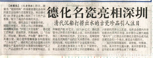 【本報(bào)訊】 (記者饒潔)昨日,被譽(yù)為“瓷國(guó)明珠”的福建省德化縣在深圳高交會(huì)館舉行名瓷展覽會(huì),來自德化的120多家企業(yè)精心組織了十萬(wàn)件產(chǎn)品參展,吸引了海內(nèi)外客商的關(guān)注。