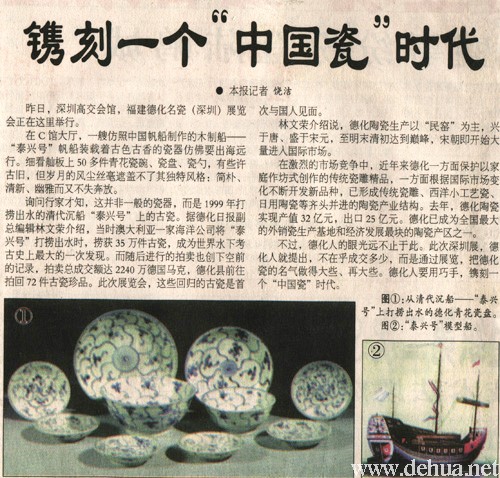 詢問行家才知,這并非一般的瓷器,而是1999年打撈出水的清代沉船“泰興號”上的古瓷。據(jù)德化日報副總編輯林文榮介紹,當(dāng)時澳大利亞一家海洋公司將“泰興號”打撈出水時,撈獲35萬件古瓷,成為世界水下考古史上最大的一次發(fā)現(xiàn)。而隨后進(jìn)行的拍賣也創(chuàng)下空前的記錄,拍賣總成交額達(dá)2240萬德國馬克,德化縣前往拍回72件古瓷珍品。此次展覽會,這些回歸的古瓷是首次與國人見面。