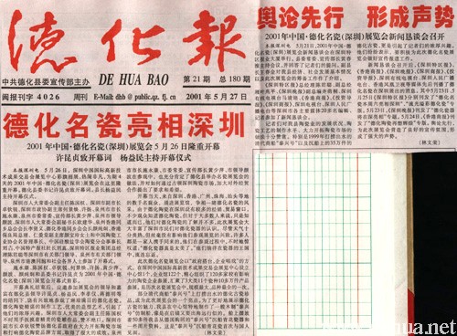 新聞懇談會(huì)召開(kāi)后,《深圳特區(qū)報(bào)》、《香港商報(bào)》、《深圳晚報(bào)》、《深圳商報(bào)》、《投資導(dǎo)報(bào)》、深圳有線電視臺(tái)、深圳人民廣播電臺(tái)、香港鳳凰衛(wèi)視等媒體先后刊播了德化名瓷在深圳展出的消息。其中5月23日、5月25日《深圳特區(qū)報(bào)》分別刊發(fā)了“德化名瓷本周六亮相深圳”、“流光溢彩德化瓷”專(zhuān)版。5月23日,《深圳晚報(bào)》刊發(fā)了“德化瓷器將在深亮相”專(zhuān)題。5月24日,《香港商報(bào)》刊發(fā)了“德化陶瓷再塑輝煌”專(zhuān)版。輿論先行,為此次展覽會(huì)營(yíng)造了良好的宣傳氛圍,形成了強(qiáng)大的聲勢(shì)。 (林文榮)