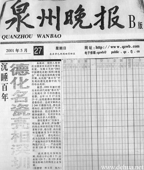 據(jù)悉,1999年被打撈出水的清代商船“泰興號”上發(fā)現(xiàn)有35萬件的德化瓷器,去年11月17日至25日,這些瓷器在德國被 悉數(shù)拍賣,總成交額高達(dá)2240萬德國馬克。德化縣得知后,前往拍回了72件瓷器珍品。經(jīng)過全國各大媒體披露后,見識百年名瓷成為許多人的愿望。
