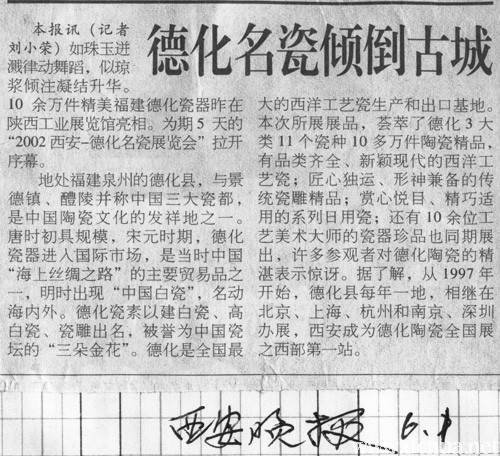 地處福建泉州的德化縣,與景德鎮(zhèn)、醴陵并稱中國(guó)三大瓷都,是中國(guó)陶瓷文化的發(fā)祥地之一。唐時(shí)初具規(guī)模,宋元時(shí)期,德化瓷器進(jìn)入國(guó)際市場(chǎng),是當(dāng)時(shí)中國(guó)“海上絲綢之路”的主要貿(mào)易品之一,明時(shí)出現(xiàn)“中國(guó)白瓷”,名動(dòng)海內(nèi)外。德化瓷素以建白瓷、高白瓷、瓷雕出名,被譽(yù)為中國(guó)瓷壇的“三朵金花”。德化是全國(guó)最大的西洋工藝瓷生產(chǎn)和出口基地。本次所展展品,薈萃了德化3大類11個(gè)瓷種10多萬(wàn)件陶瓷精品,有品類齊全、新穎現(xiàn)代的西洋工藝瓷;匠心獨(dú)運(yùn)、形神兼?zhèn)涞膫鹘y(tǒng)瓷雕精品;賞心悅目、精巧適用的系列日用瓷;還有10余位工藝美術(shù)大師的瓷器珍品也同期展出,許多參觀者對(duì)德化陶瓷的精湛表示驚訝。據(jù)了解,從1997年開始,德化縣每年一地,相繼在北京、上海、杭州和南京、深圳辦展,西安成為德化陶瓷全國(guó)展之西部第一站。