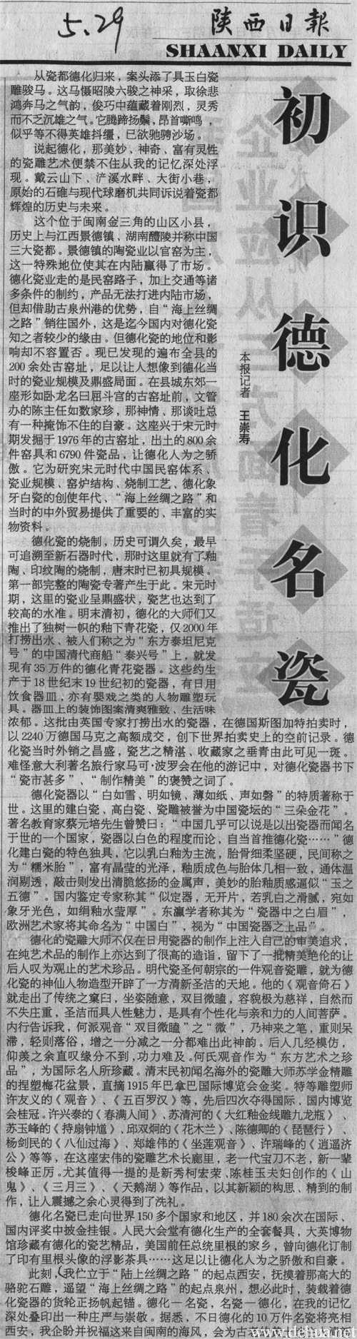 此刻,峨佇立于“陸上絲綢之路”的起點(diǎn)西安,撫摸著那高大的駱駝石雕,遙望“海上絲綢之路”的起點(diǎn)泉州,想必此時(shí),裝載著德化瓷器的貨輪正揚(yáng)帆起錨。德化一名瓷,名瓷一德化,在我的記憶深處疊印出一種莊嚴(yán)與崇敬。據(jù)悉,不日德化的10萬件名瓷將亮相西安,我企盼并祝福這來自閩南的海風(fēng),會(huì)為古老的黃土地注入清新的氣息與藍(lán)色的活力。