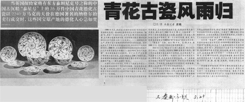1999年5月,英國海上打撈專家邁克·哈徹在南中國海附近發(fā)現(xiàn)一艘清朝光緒年間沉沒的中國商船“泰星”號(hào),撈獲了大量的珍寶,其中包括35萬件的德化瓷器,且大部分瓷器完好無損。這些瓷器大都是18世紀(jì)和19世紀(jì)初中國著名的三大古瓷都之…福建德化所生產(chǎn),并用于出口亞洲市場的明清時(shí)代青花瓷器。其中也有生產(chǎn)于更早年代的瓷器被發(fā)現(xiàn),有些甚至可追溯到15世紀(jì)。2000年,這位英國探險(xiǎn)家在德國斯圖加特城中心火車站展覽館花巨資建造了一座仿制的“泰星號(hào)帆船樓”,將這批瓷器進(jìn)行長期展覽。并于11月17日至25日將其部分進(jìn)行拍賣,總成交額高達(dá)2240萬德國馬克,僑居德國的福建德化籍華僑鄭德力博士獲悉后與這些瓷器的產(chǎn)地——德化縣取鑷了聯(lián)系。