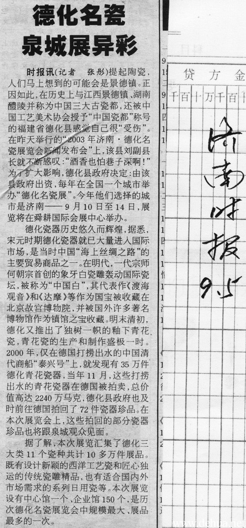時(shí)報(bào)訊(記者 張 彤)提起陶瓷,人們馬上想到的可能會(huì)是景德鎮(zhèn)。正因如此,在歷史上與江西景德鎮(zhèn)、湖南醴陵并稱為中國(guó)三大古瓷都,還被中國(guó)工藝美術(shù)協(xié)會(huì)授予“中國(guó)瓷都”稱號(hào)的福建省德化縣感覺自己很“受傷”。在昨天舉行的“2003年濟(jì)南·德化名瓷展覽會(huì)新聞發(fā)布會(huì)”上,該縣劉副縣長(zhǎng)就不斷感嘆:“酒香也怕巷子深啊!”為了擴(kuò)大影響,德化縣政府決定:由該縣政府出資,每年在全國(guó)一個(gè)城市舉辦“德化名瓷展”。今年他們選擇的城市是濟(jì)南——9月10日至14日,展覽將在舜耕國(guó)際會(huì)展中心舉辦。