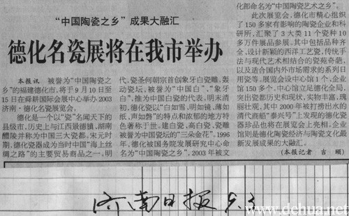 本報訊 被譽為“中國陶瓷之鄉(xiāng)”的福建德化市,將于9月10日至15日在舜耕國際會展中心舉辦2003濟南·德化名瓷展覽會。