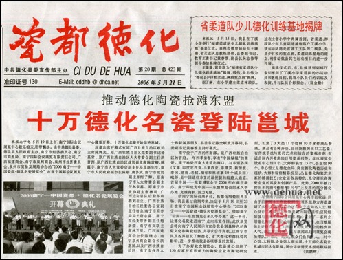 5月19日上午,南寧國(guó)際會(huì)議展覽中心鼓樂(lè)喧天,彩帶飄揚(yáng)。由中共德化縣委、德化縣人民政府主辦,南寧市經(jīng)濟(jì)委員會(huì)、南寧市商務(wù)局、南寧國(guó)際會(huì)議展覽有限責(zé)任公司、廣西福建商會(huì)、南寧市泉州商會(huì)、泉州市經(jīng)濟(jì)委員會(huì)、泉州市貿(mào)易發(fā)展局協(xié)辦的“2006南寧——中國(guó)瓷都·德化名瓷展覽會(huì)”在南寧國(guó)際會(huì)議展覽中心隆重開幕。十萬(wàn)德化名瓷開始驚艷邕城。