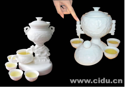 在開(kāi)發(fā)原有系列產(chǎn)品的基礎(chǔ)上,顏寶敬認(rèn)識(shí)到在激烈的市場(chǎng)競(jìng)爭(zhēng)下,企業(yè)要生存發(fā)展,必須有獨(dú)一無(wú)二的產(chǎn)品。2005年10月,顏先生就組織恒越陶瓷研究所開(kāi)始著手研發(fā)新產(chǎn)品,僅用了半年多的時(shí)間,卓越陶瓷公司就成功推出以“九龍盛世”為代表的半自動(dòng)、全自動(dòng)茶具。這些自動(dòng)茶具系列科技含量高,在頂末兩端設(shè)有磁鐵,形成正負(fù)兩極相吸的磁場(chǎng),同時(shí),杠桿和活塞被安裝在磁場(chǎng)當(dāng)中,使用可以移動(dòng)帶有磁鐵的裝置去改變磁場(chǎng),從而利用杠桿作用,拉動(dòng)活塞工作,在活塞作用下,每次磁場(chǎng)的變動(dòng)都可定量倒?jié)M茶杯的七分就自動(dòng)停下。這種品茶方式,既不燙手、又能保溫,而且休閑方便。