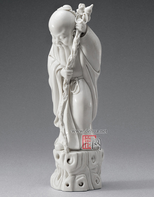 清,德化窯壽星像,高23.5cm,壽星笑容可掬,兩手持壽杖,站立於一山石之上,杖首系一葫蘆,壽星姿態(tài)生動。通體施白釉,釉質(zhì)肥厚。