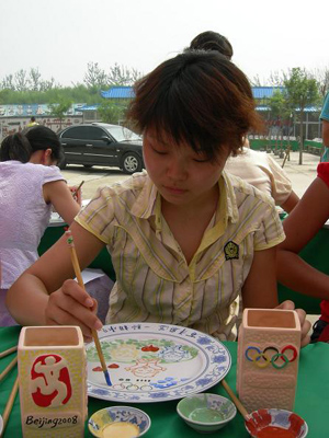 千龍網(wǎng)北京8月8日訊 在北京喜迎奧運(yùn)倒計(jì)時(shí)一周年之際,今天上午,來自首都各界的女性知名人士、女書法家、女畫家、女企業(yè)家、三八紅旗手、各級(jí)婦聯(lián)干部等百余名婦女代表來到北京佐特陶瓷藝術(shù)活動(dòng)中心,在磁盤上親手繪制“我心中的奧運(yùn)”,將自己對(duì)2008奧運(yùn)的祝福和期盼化為陶瓷上的精美圖案。