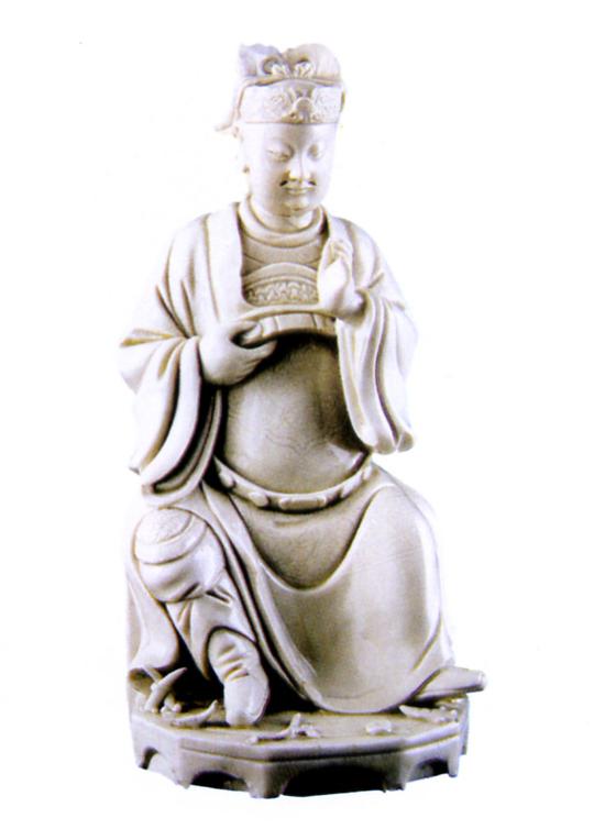 白釉財神坐像,萬歷庚戍年(1610年),高26.5厘米,塑像造型典雅,人物形象傳神,衣紋線條流暢,細部刻劃簡潔,釉水微泛黃色,背部刻銘有“萬歷庚戍年春……”等字樣。