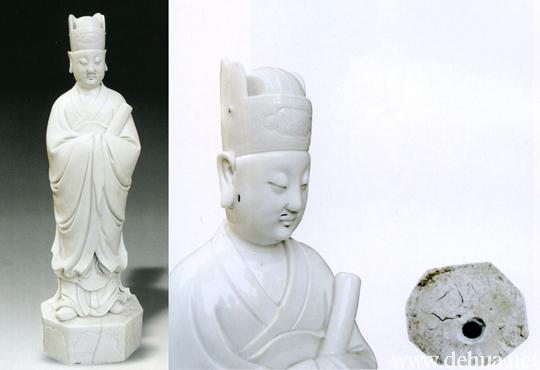 釉色白中閃黃,呈象牙色,溫潤(rùn)細(xì)膩。文官頭戴官帽,丹鳳眼,鬢須以真毛填補(bǔ),雙手合攏于衣袖內(nèi),作執(zhí)笏板狀,神態(tài)閑然自若,立于臺(tái)上,精雕細(xì)刻,線條圓潤(rùn)、流暢、洗練。底部?jī)H留一小洞,系以整塊瓷泥捏塑而成,胎體渾厚,有窯裂。