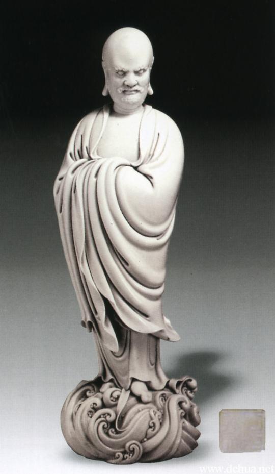 達(dá)摩容貌威嚴(yán),身材偉岸,雙手?jǐn)n袖于胸前,赤足立于波濤之上,取材于達(dá)摩一葦渡江故事。此尊塑像胎體厚重,潔白堅(jiān)實(shí),通體施象牙白釉,釉面純凈瑩潤(rùn),背部鈐有“何朝宗印”方形印章款。