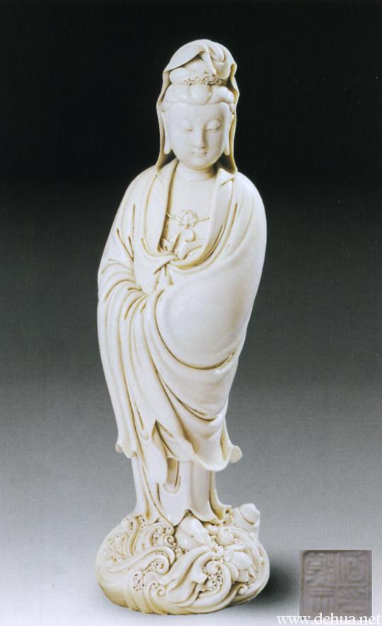 釉色白中泛黃,呈牙白色,如凝脂凍玉,滋潤瑩滑。觀音雙手藏袖,露一足踏蓮花,另一足水花掩蓋,作踏浪凌波渡海之勢。觀音神情嫻雅平靜,安詳自若,雙目低垂凝思。整座塑像精巧細致,神態(tài)如生,背鈐有“何朝宗印”方形印章款。