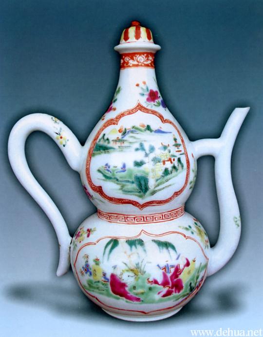 ▲清早期 五彩山水人物紋倒流壺(許回成藏) 高32厘米,底徑14厘米
