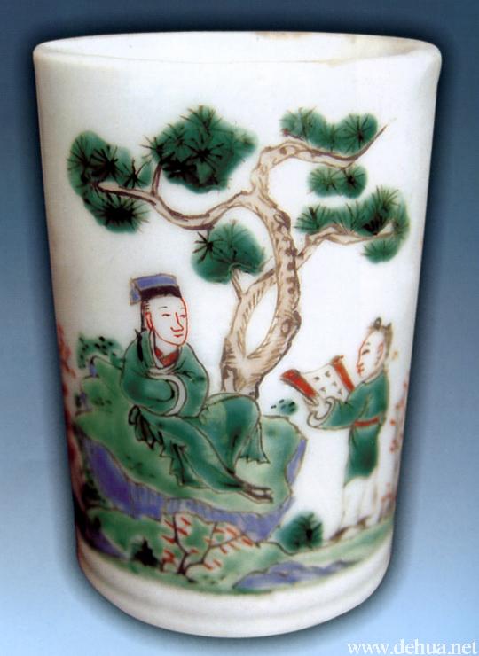 ▲清 五彩山水人物紋筆筒(陳明良藏) 高9.5厘米,口徑6.5厘米