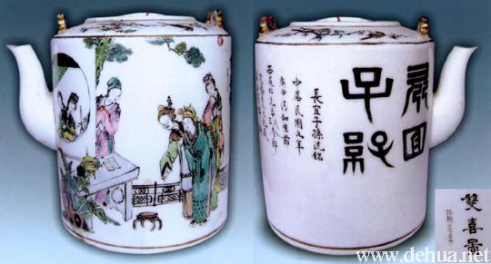 ▲民國(guó)九年(1920年) 五彩“雙喜圖”茶壺 高14.5厘米,口徑14.5厘米