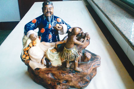 有錢能使鬼推磨:這件瓷塑人物像,造型準確、比例恰當,不僅人物形象逼真,而且神氣活現(xiàn)。有錢者的訕笑,透出一種得意的內(nèi)心滿足,瘦骨如柴為利驅(qū)使的小鬼,又有不堪重負的無奈。為了錢,又有多少人能擺脫它的誘惑?