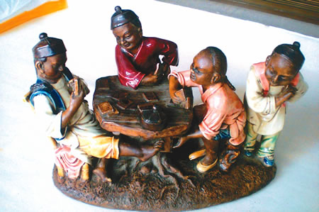 童趣:這組瓷塑人物像,一覽無余地構(gòu)造出兩個童子在玩牌過程中的串通手法,就是以桌子和帽子作遮掩,把對方所需要的牌用腳趾夾過去,而玩牌的第三方童子卻茫然不知,這一情景卻被站在旁邊的童子發(fā)現(xiàn)了。這件作品妙在瓷塑大師把這一瞬間定格下來,表現(xiàn)出串通方童子的心機和巧妙。在現(xiàn)實生活中,不是也有不少人在演繹著類似的作弊手法嗎?