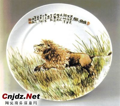 近代中國外憂內患不斷,帝國主義列強侵略、瓜分中國,但國人處于麻木不覺悟狀態(tài)。這一社會現實在陶瓷詩里都有所反映,F藏于中國歷史博物館的一件瓷碗,碗壁繪一人臥于石上酣睡,一猛虎正向其撲來,還有二虎正在撕斗。一面題跋:“餓虎回至,我睡猶酣,雄雞一鳴,人夢咸醒”。有人燒制繪有醒獅的瓷盤,期待有人喚醒中國這頭睡獅(下圖)。反動統(tǒng)治階級的殘酷剝削和壓迫,加上持續(xù)不斷的天災人禍,老百姓生活在水深火熱之中。景德鎮(zhèn)燒制的題為《漁》和《耕》的瓷板畫(作者為王大凡)題寫的詩反映了舊中國這一社會現實:“撒網無魚蝦,官稅不能賒;網來難換米,空坐對蘆花”。“去歲遭荒旱,今春又決堤;終年耕褥者,不得飽妻兒”。