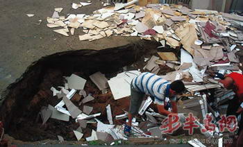 7月3日上午9時許,膠南市瑯琊臺路南端突然發(fā)生公路塌方事件,形成的大坑將馬路邊一家陶瓷專賣店價值近萬元的瓷磚“吞掉”。記者在現(xiàn)場看到,塌下的大坑深5米,長8米,寬有4米,里面填滿了破碎的瓷磚。據(jù)介紹,塌方處的公路下面有管道,沙土比較松軟,上面長期放置著大量瓷磚形成壓力,再加上近期連降大雨,因此造成塌方。