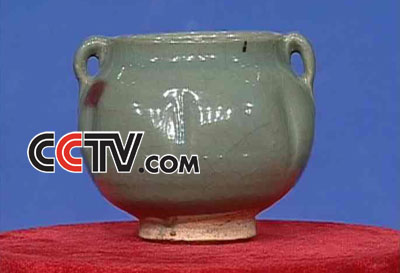 藏品特征:這件藏品為一個瓜棱雙耳罐,通高為厘米,口沿直徑10厘米,腹徑14厘米,底足直徑6.5厘米,底足無釉無款。左側(cè)有一塊紅色的斑,罐的內(nèi)外均施釉,釉色為灰蘭色,品相完好。