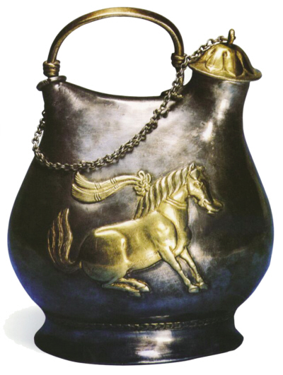 舞馬銜杯紋銀壺系用銀片錘打、焊接而成。壺口位于頂部一側(cè),形體粗短,略呈圓柱狀,其上配有鎏金覆蓮形蓋,壺蓋以一條銀鏈與弧形鎏金提梁相連;壺腹為扁圓形,下接圈足,微向外撇。就其形制而言,顯然是模仿北方草原游牧民族所習(xí)用的皮囊壺。壺身兩側(cè)各飾一捶揲出的鎏金舞馬紋樣,舞馬口銜酒杯,頸上彩帶飛舞,昂首奮蹄,前腿直立,后腿彎曲,長(zhǎng)尾上揚(yáng),正自翩翩起舞;壺身與圈足相接處飾有“同心結(jié)”一周,亦鎏金。該件作品造型飽滿,富有張力,線條圓潤(rùn)自然,比例恰當(dāng)。舞馬紋樣由于是錘凸成像,馬具有立體感,結(jié)構(gòu)準(zhǔn)確,生動(dòng)逼真;邊緣處理巧妙圓熟,具有極好的體積感和空間感;工匠善于抓住瞬間的動(dòng)作表現(xiàn)駿馬曼妙的舞姿,飄拂的鬃毛,飛揚(yáng)的綬帶,以及奮首鼓尾的姿態(tài),使舞馬獻(xiàn)壽時(shí)“