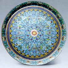此盤為銅胎,形制碩大。盤心飾一大蓮花紋,布局于整體盤心之中,蓮花紋外圈飾回紋和如意云頭紋,盤底則以鮮艷的花蝶圖案裝飾。
