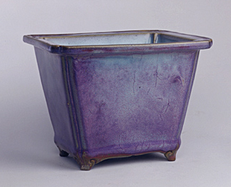 花盆呈長方形,折沿,斜直壁,平底,四角有足。通體施天青色和玫瑰紫色釉。釉面呈現(xiàn)“蚯蚓走泥”紋。外底施醬色釉,并刻有書目字“十”。
