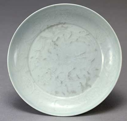 元代卵白釉瓷器的造型以盤、碗、高足碗最為多見,裝飾技法以印花為主,刻劃花為輔。盤、碗之內(nèi)壁往往橫印纏枝花卉或云龍、云鳳、云鶴、花鳥、纏枝蓮?fù)邪思榈,有的器物在花紋間模印官府銘文或吉祥文字,其中最為多見的是“樞府”銘,因此,有時人們又將卵白釉瓷稱作“樞府瓷”。除了“樞府”、“太禧”之外,還有“東衛(wèi)”、“昌江”、“南水”、“福祿”、“福壽”、“白王”、“天順年造”等銘款。“樞府”、“太禧”分別代表元代最高軍事機(jī)關(guān)“樞密院”和專掌宮廷祭祀的機(jī)構(gòu)“太禧宗禋院”!对贰肪戆耸撸ò俟僦荆┯涊d:“太禧宗禋院……,掌神殿朔歲時忌諱日辰 享禮典。天歷元年,罷會福、殊祥二院,改置太禧院以總制之。”由此可知,“太禧”銘卵白釉瓷的燒造年代應(yīng)在太禧宗 禋院的設(shè)立之年天歷元年(1328年)以后,其下限當(dāng)在元末農(nóng)民起義軍占領(lǐng)浮梁地區(qū)的1352年。