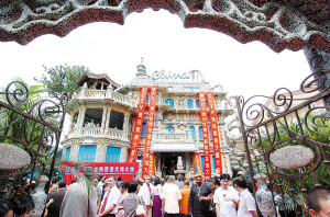 這棟老舊的房子經(jīng)過他的巧思妙想和精心裝修后,貼滿了4億多古瓷片、13000多件古瓷器、300多件漢白玉石雕、300多只隨處可見的瓷貓枕和20多噸天然水晶、瑪瑙。就連屋子里都用瓷片拼貼出了中外名畫的圖案,齊白石、徐悲鴻、梵·高、達(dá)·芬奇等藝術(shù)大師的畫作在瓷片的還原下,呈現(xiàn)出獨(dú)特的韻味。“瓷房子”內(nèi)還巧妙放置了古代木樓、古家具等古物,處處洋溢著濃濃的東方情調(diào),成為張連志向世人展示中華文化的一張名片和本市一道獨(dú)特的旅游文化景觀。特別是盤旋在瓷房子上的巨龍?jiān)煨,和那些看似隨意但獨(dú)具匠心的中國符號,巧妙地融合了西方建筑與中國古瓷的美,堪稱一絕。張連志在接受記者采訪時表示,瓷房子是他表達(dá)對中華文明敬意和對家鄉(xiāng)深情的一件作品,蘊(yùn)涵著一顆中國心。作為中國人,他要通過“瓷房子”向世界展示古老的瓷文化;作為天津人,他要向世界展示天津的形象。