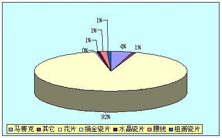 從這個圖中我們可以很清楚的看到,花片的供應(yīng)量占據(jù)了整個建筑陶瓷產(chǎn)品的供應(yīng)量的92%,其后依次是馬賽克、水晶瓷片、腰線和組畫瓷片,因此提醒廣大商友,對于花片這個市場,已經(jīng)出現(xiàn)很明顯的供大于求,所以生產(chǎn)或是銷售都需謹(jǐn)慎。