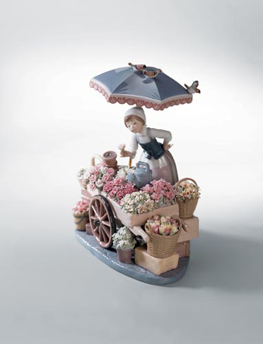 這件作品創(chuàng)作于1983年,是雅致相當經典的一件作品。一位小女孩在滿是花朵的花車旁留連忘返,花車頂上還停著幾只小鳥,一派春機盎然的景象。這件作品極盡地表現了雅致經典的花朵制藝,每一個花籃中都盛放著不同的花朵,形態(tài)、顏色各異,甚至連每個花籃也各不相同,各種材質在陶瓷的雕琢下逼真展現。