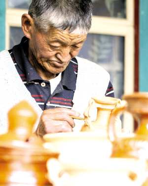 墨竹工卡縣工卡鎮(zhèn)塔巴村制陶業(yè)已有近百年歷史。隨著我區(qū)旅游業(yè)的發(fā)展,民族陶瓷工藝品也走俏旅游市場,激發(fā)了塔巴村村民的制陶積極性,目前全村60%的村民都參與陶瓷制作,有效增加了群眾的現(xiàn)金收入。圖為76歲高齡、具有40多年制陶經(jīng)驗的工藝師堅參正在制作陶瓷!