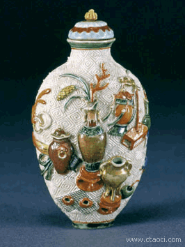 粉彩雕瓷博古圖鼻煙壺,清乾隆,通高8cm,腹徑4.3cm。清宮舊藏