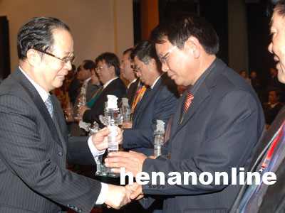 全國(guó)政協(xié)副主席張懷西在人民大會(huì)堂主席臺(tái)給第六界“新世紀(jì)之聲”中國(guó)十大杰出新聞人物李廷懷頒獎(jiǎng)