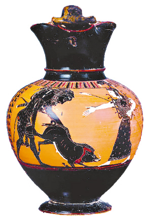 陶瓶上繪著希臘英雄赫拉克里斯,他在守護(hù)女神雅典娜的幫助下,活捉一只危害鄉(xiāng)村多年的野獸厄律曼托斯山野豬,用來獻(xiàn)給國王尤里士修斯。