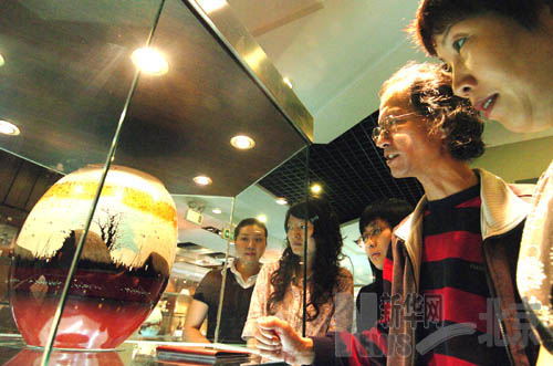 9月21日,江西省工藝美術(shù)大師方文賢(右二)在北京王府井景德鎮(zhèn)陶瓷城向觀眾介紹他的作品——色釉彩繪“初春”瓶。