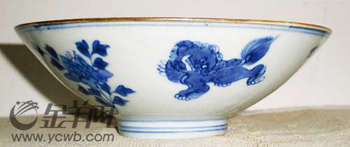 從胎釉看,胎質(zhì)結(jié)實(shí),釉色青中偏白,不像明末的鴨蛋青那么青;圈足處有明顯的火石紅,且有弧度,而非垂直;獅子的眼睛微凸,神態(tài)自然可愛,都具有明末的繪畫風(fēng)格?梢哉f這只碗是處在過渡時(shí)期的作品,未完全形成清康熙的風(fēng)味,應(yīng)該屬于康熙早期的作品。