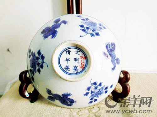 該碗底款雖是”大明嘉靖年制”,卻具有典型的清初風(fēng)格。首先款識(shí)的字體和筆法幼細(xì)有力,是康熙的風(fēng)格。這種底款叫”寄托款”,即明清一些瓷器中不題寫本朝代的年款或堂名款而題寫前一朝或幾朝的款識(shí),稱之寄托款。清初