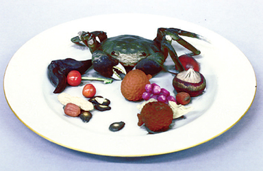 乾隆一朝是清代社會(huì)發(fā)展的鼎盛時(shí)期。此時(shí),以景德鎮(zhèn)官窯為代表的制瓷業(yè),不僅精于仿制歷代名瓷,而且在繼承和發(fā)揚(yáng)前代瓷器藝術(shù)的基礎(chǔ)上創(chuàng)新出眾多新奇的品種,把清代制瓷業(yè)推向創(chuàng)造性的階段。“象生瓷”即是當(dāng)時(shí)的新作,它以瓷塑的方式摹仿自然界的花果或水生小動(dòng)物的形象,如:核桃、棗、栗子、花生、瓜子、蓮子、荔枝、櫻桃、橘子、荸薺、石榴、菱角和河蚌、蝦、海螺、螃蟹等。這些瓷塑造型準(zhǔn)確,大小與原物相當(dāng),所施彩釉細(xì)膩逼真,給人以宛如真物再現(xiàn)的新奇精巧的藝術(shù)享受。此類象生瓷塑除少數(shù)單獨(dú)成器外,一般多黏結(jié)于圓盤或高足盤上,供宮內(nèi)御用陳設(shè)和玩賞。