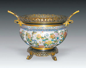 根據(jù)胎地的不同,琺瑯器一般可以分為金胎琺瑯、銅胎琺瑯、瓷胎琺瑯、玻璃胎琺瑯、紫砂胎琺瑯等,而最為常見的是金屬胎琺瑯器。其中銅胎琺瑯因為銅料與表面琺瑯容易結(jié)合,且銅料價格相對容易接受,因此銅胎琺瑯最為廣泛。金屬胎琺瑯器依據(jù)具體加工工藝的不同,又可分為掐絲琺瑯器、鏨胎琺瑯器、畫琺瑯器和透明琺瑯器等幾個品種。掐絲琺瑯器在國內(nèi)出現(xiàn)比較早,歷史記載可追溯到宋元時期,在明景泰和成化兩朝最為常見,即是俗稱的“景泰藍”。