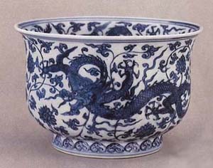 正德以回青燒造青花,色近似磚色,青花有淡描的畫法。除青花外,尚有黃、綠彩。正德的祭紅質(zhì)量也比較好。