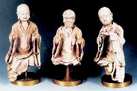 當(dāng)欣賞這組羅漢像時,可感到有一種粗獷、蒼勁、人格化的古拙美。按一般所見宋代瓷塑佛像,衣服均上青白釉,而頭、頸、手均為素胎,但此三尊羅漢像,衣袖內(nèi)可見青白釉,而衣袍正面卻為素胎,頭、手也無釉,細(xì)辨表面又不似脫釉(一般影青瓷青白釉不會脫釉),是反瓷,還是當(dāng)時未上釉的殘次品,待考。