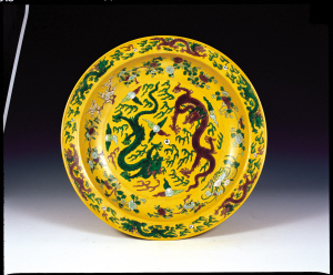 本次展出的器物種類繁多、釉彩齊全、別具一格,紋飾題材廣泛、吉祥如意。有體現(xiàn)皇家嚴(yán)明等級(jí)的后宮用瓷,在《國(guó)朝宮史》卷十七“經(jīng)費(fèi)一”中記載:里外全黃色為皇太后、皇后使用;里白外黃色為皇貴妃使用;黃地綠龍為貴妃、妃使用;藍(lán)地黃龍為嬪使用;綠地紫龍為貴人使用;五彩紅龍為常在使用;有工藝精湛的奇巧別致之作;有官窯的必須燒制的器物,像日常用的杯、碗、碟等,以及祭祀用瓷、賞賜用瓷等;有頗具仿古意韻的仿前朝窯口、青銅器、瓷器等的器物;有帶有瓷畫、花鳥畫風(fēng)格的器物等等,可以說是琳瑯滿目,美不勝收。
